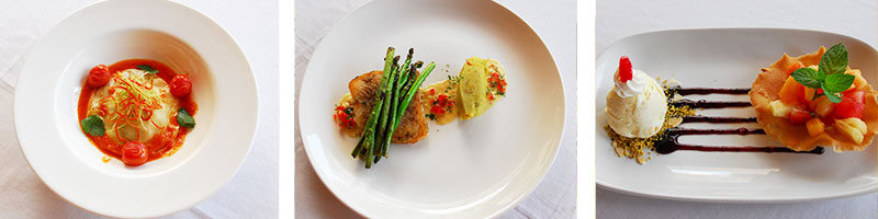 | 【前菜】プラウンラビオリ(プチトマト、チリ、エビのミックスサラダ) 【メイン】スネーパー(インドネシア鯛)のフィレット焼き、スウィートポテトのピューレとアスパラガスのバター炒め 【デザート】バニラのアイスクリームとフルーツカシューナッツ |