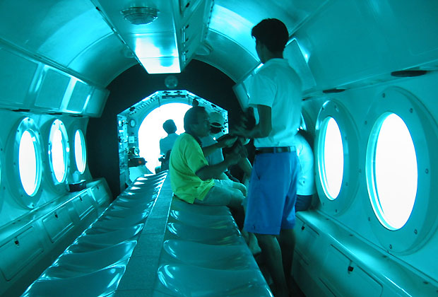 海中に潜りたいのは皆、同じ思いでした。 じゃあ~何にする?で、サブマリン潜水艦に決まりました。 これなら日焼けしないし、濡れませんからね。 ダイバーさんが魚を寄せてくれたので、皆でワイワイ楽しめました(^_^)v