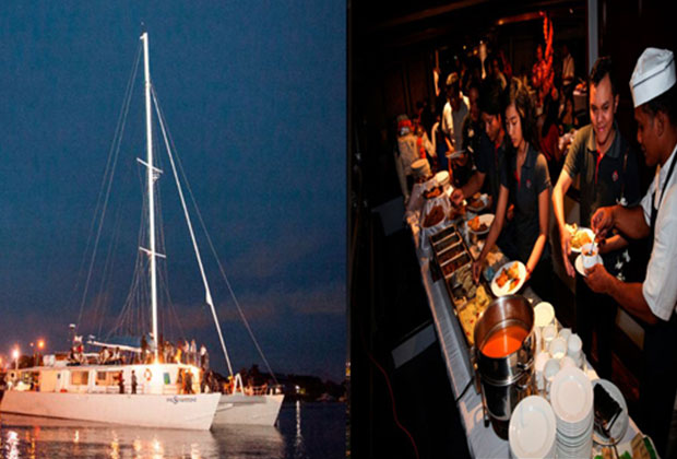 こちらの「セイルセンセーション トワイライトクルーズ」は20名以上の参加が条件なので、人数がそれ以上集まらないと体験できないので、ちょっとハードルが高いと思いますけど、人数が集まったらぜひ参加してほしいディナークルーズです。結構大きいクルーザーなので、デッキだけでなく室内も結構広くて、インテリアも高級感のある感じでした。その室内でコースディナーをいただき、プライベートパーティーのような感覚で2時間ほどのディナータイムを過ごしました。ライブ演奏もありましたが、基本仲間でワイワイとお酒などを楽しみながら話をしたり、デッキに出て夜景や星空を見たりといったゆったりとした過ごし方をしてとても楽しい夕べでした。
