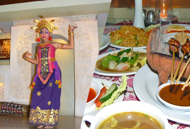 インドネシアの宮廷料理が食べられるお店だとガイドブックに載っていたので、ウブド観光の帰りにディナーで寄っていただきました。場所もウブドからクタに帰る途中にあって、アクセスも便利でした。とても大きなレストランで、そこで宮廷料理をいただいたのですが、昔の宮廷につかえる女官の格好をしたスタッフさんがずらっと並んで私たちの料理を運んできてくれて、一品ずつサーブしてくれるのが何とも言えず優雅な気分に浸ることができました。ダンスパフォーマンスもとても本格的で、バリの伝統舞踊だけでなく、ジャワの伝統舞踊も見ることができて、なかなか見ごたえのあるショーだったと思います。値段もリーズナブルでしたし、おすすめのレストランです。